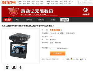 | ◆日本のネット市場で約4000円で取引されている低価格帯ドライブレコーダー。タオバオ安値は118元(約1600円) いくら低価格帯といっても日本で1000円台で購入できる製品ではないということは調べればすぐ分かります。 ある程度まとまった量を仕入れると送料も圧縮できます。2012/4 |